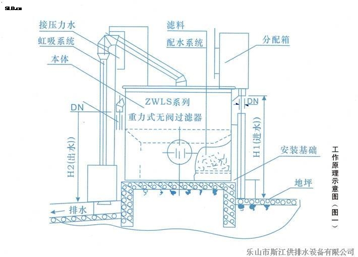 原水不斷自進水管進入虹吸上升管在輔助虹吸管的管口處,進入輔助虹吸管并沿該管下跌,在下跌過程中通過“抽氣三通”,并帶走“抽氣三通”側管內的空氣,而“抽氣三通”側管是連接虹吸管系統倒置U型管頂部的,這樣,“抽氣三通”就抽吸了虹吸管系統倒置U型管頂部和虹吸下降管內的空氣,由于虹吸下降管的下部管口在排水水封內被水封住管口,于是倒置U型管頂部及虹吸下降管內逐漸形成負壓,并且真空度逐漸增大,水封內的水在虹吸下降管的液面從“反沖洗前,管內最低水位”迅速上升,并越過倒置U型管頂部,與虹吸上升管內的原水匯合,形成虹吸,原水沿虹吸下降管下跌,于是反沖洗開始了,清水自清水區沿數條連通管,清水管由上而下進入集水區,從集水區通過網板、承托層,自下而上反沖濾料,使濾層處于膨脹,濾料相互摩擦、碰撞狀態,被截留和吸附在濾料層內的懸浮物等污物隨水流通過渾水區,進入虹吸管系,沿虹吸上升管,虹吸下降管進入排水水封井,流至下水管網。在反沖洗過程中,清水區內的水面迅速下降,同一體相隔的另一室的清水,進入正在反沖洗的一室內,參與反沖洗,以保證足夠的沖洗時間。當清水區內的水面降至虹吸破壞斗管口時,空氣自虹吸破壞斗的管口進入倒置U型虹吸管系的頂部,于是虹吸被破壞,虹吸管系內的反沖洗水斷流,反沖洗結束。同時,處于膨脹狀態的濾料層的濾料下落,原水仍進入渾水區,經濾料層,開始了又一個周期的過濾。如此周而復始地過濾,反沖洗,過濾……